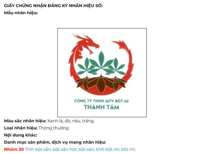 Giấy Chứng Nhận Đăng Ký Nhãn Hiệu Ngày 13/04/2026 Công ty TNHH MTV bột mì Thành Tâm đã được Cục Sở Hữu Trí Tuệ Việt Nam cấp giấy chứng nhận đăng kí nhãn hiệu chính thức.